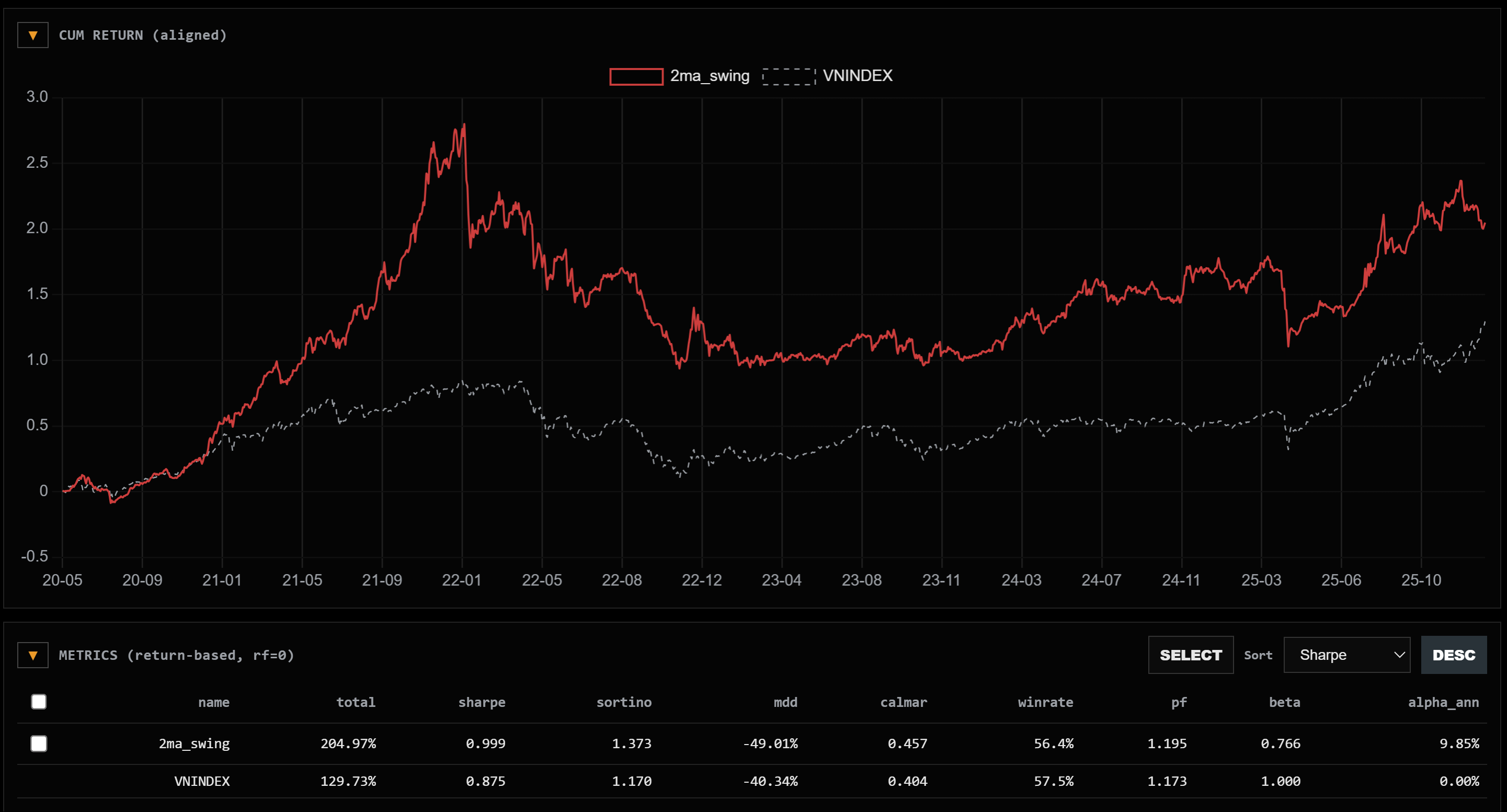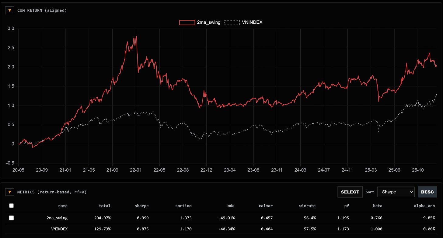 Khi trade sẽ được tự động cân đối tỷ trọng danh mục (sử dụng HRP/Inverse Volatility/MeanRisk tùy vào model nào outperform mỗi lần rebalancing) + tuân thủ constraint của thị trường (T+2.5), các chi phí giao dịch (transaction cost) sẽ được mô phỏng bằng slippage ngẫu nhiên (tất nhiên vẫn trong range của +/-7% cho HSX và HNX hoặc +/- 15% của UPCOM) và fixed cost cho thuế và phí giao dịch.