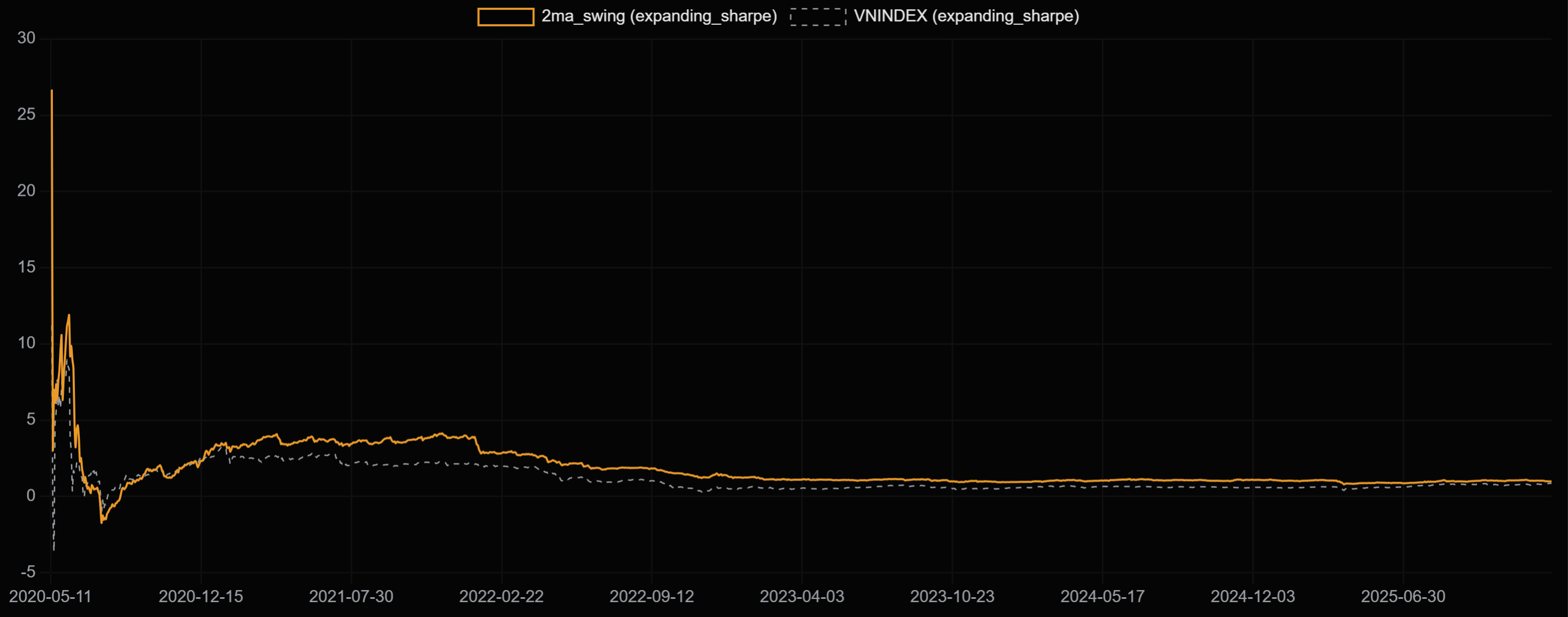 Nếu chỉ chọn 1 mốc thời gian là 2022 để đánh giá thì rõ ràng Sharpe của nó cao hơn nhiều so với VNINDEX, thậm chí hiệu suất của nó là còn rất tốt nếu nhìn hiệu quả OOS như sau: