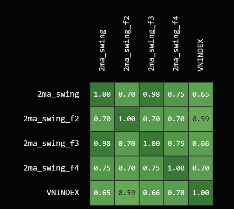 Nếu tính trung bình của tất cả các các correlation giữa các strategies trong correlation matrix này thì kết quả sẽ ~ 0.81 là rất cao và thống kê gọi đây là có hiện tượng đa cộng tuyến (multicolinearity), điều này có nghĩa là các strategies này dù có các filter khác như nhưng không khác biệt đáng kể vì bị đa cộng tuyến.