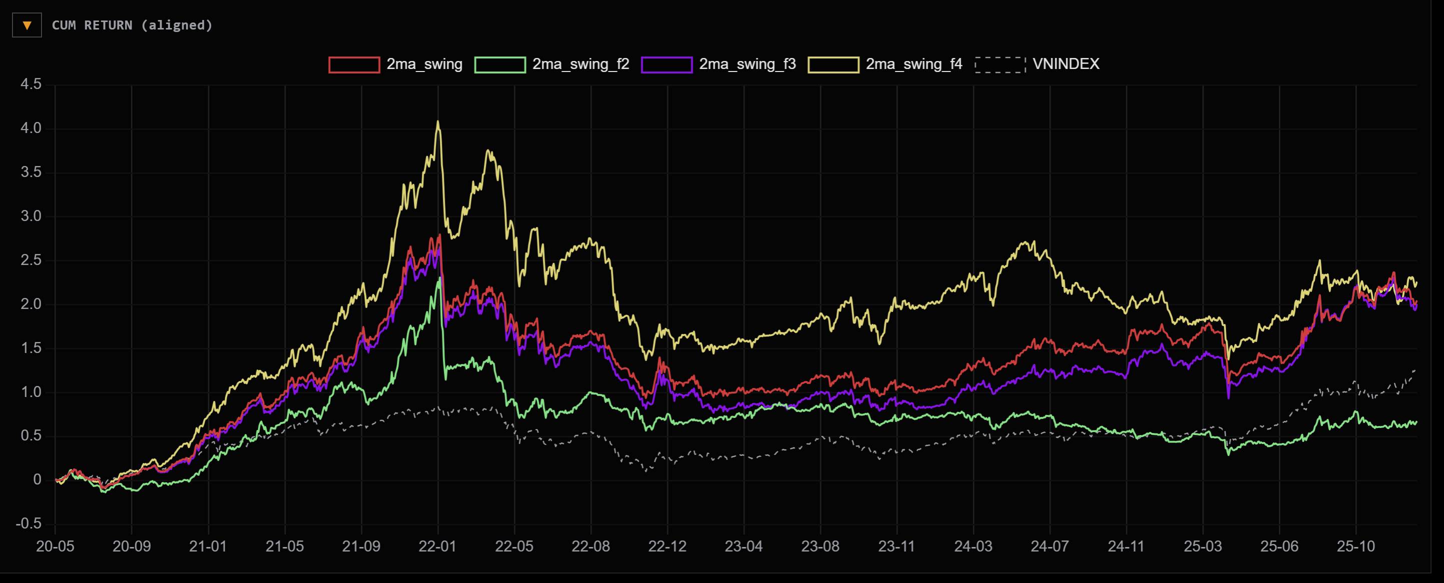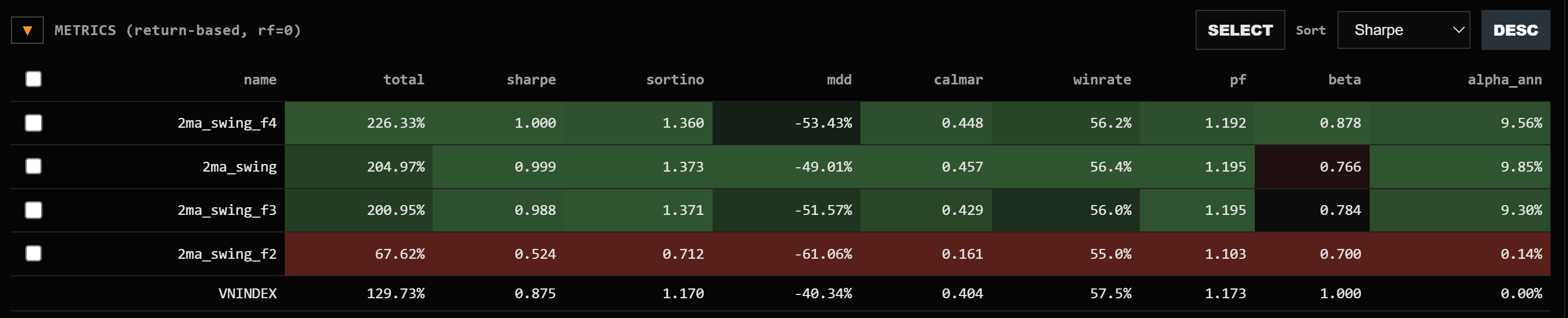 Vậy giả sử nếu chúng ta tiếp tục kiểm chứng qua các universe khác thì sao? Nếu 1 strategy ổn định thì nó phải chạy tốt qua hầu hết các tickers phải không? Nghe rất hợp lý, vậy để kiểm chứng nó thì giả sử cũng là strategy ma_swing ở trên nhưng chạy với các bộ lọc khác nhau thì kết quả sẽ như sau: